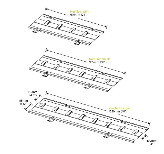 NeatTech, Humanscale’nin ödüllü yüksekliği ayarlanabilir Float Çalışma Ünitesi için tasarlanmasına rağmen, diğer çalışma üniteleri ile de kullanılmaktadır. NeatTech üç farklı boyuttadır: mini – 610mm (24 ”) uzun x 115mm (4.5”) derin x 100mm (4 ”) geniş, küçük – 965mm (38”) uzun x 115mm (4.5 ”) derin x 100mm (4”) geniş ve büyük – 1220mm (48 ”) uzun x 115mm (4.5”) derin x 100mm (4 ”) geniş.